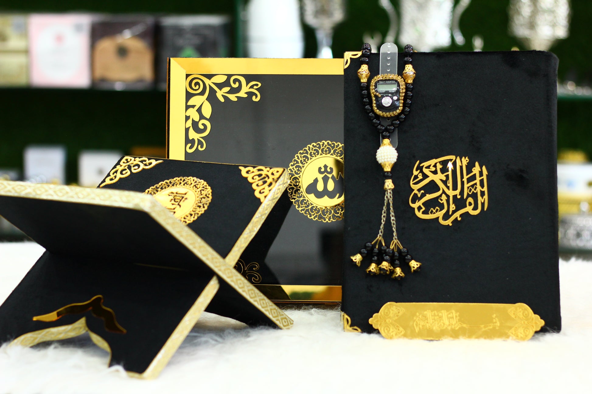 Black Acrylic Box Quran Pak with Rehal, Tasbih, and Counter