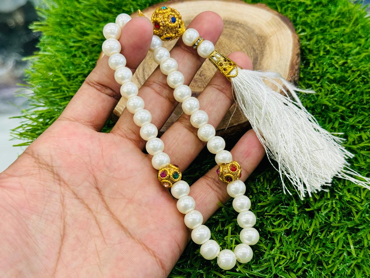 Our Fancy Pearl Tasbih is a stunning prayer bead necklace featuring 33 high-quality pearl beads, expertly crafted to provide a smooth and comfortable touch.