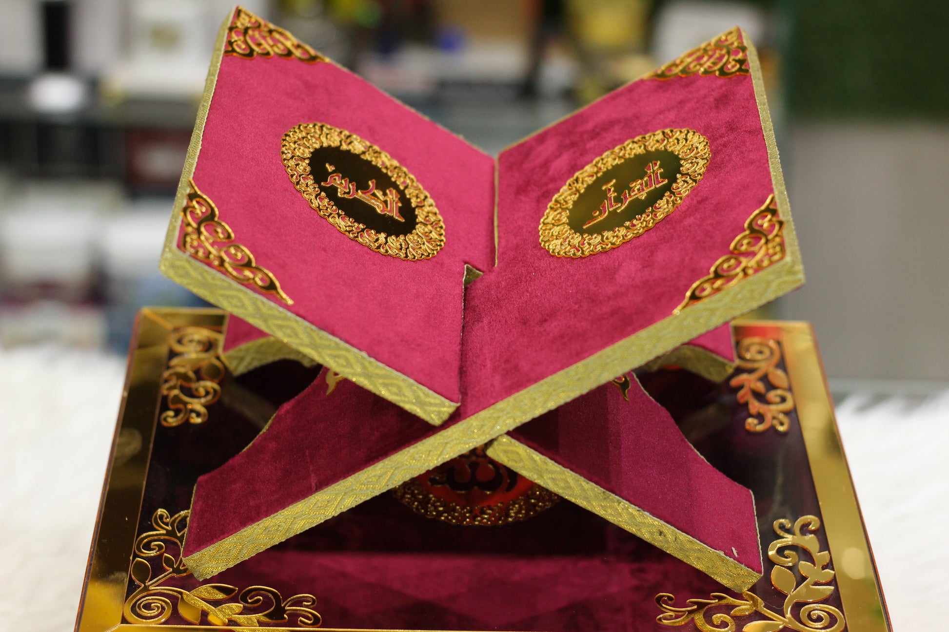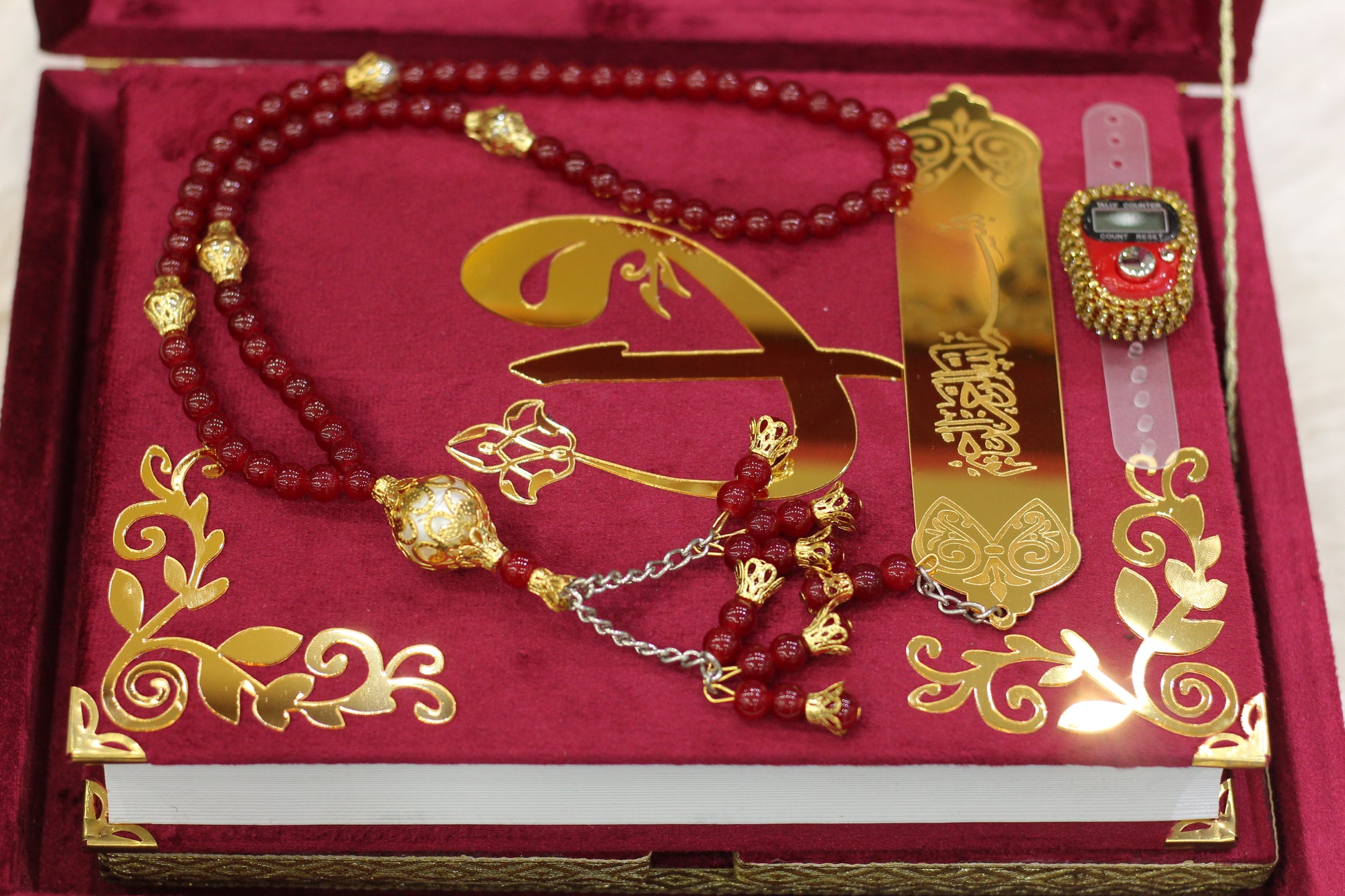 Mehroon Acrylic Box Quran Pak with Rehal, Tasbih, and Counter
