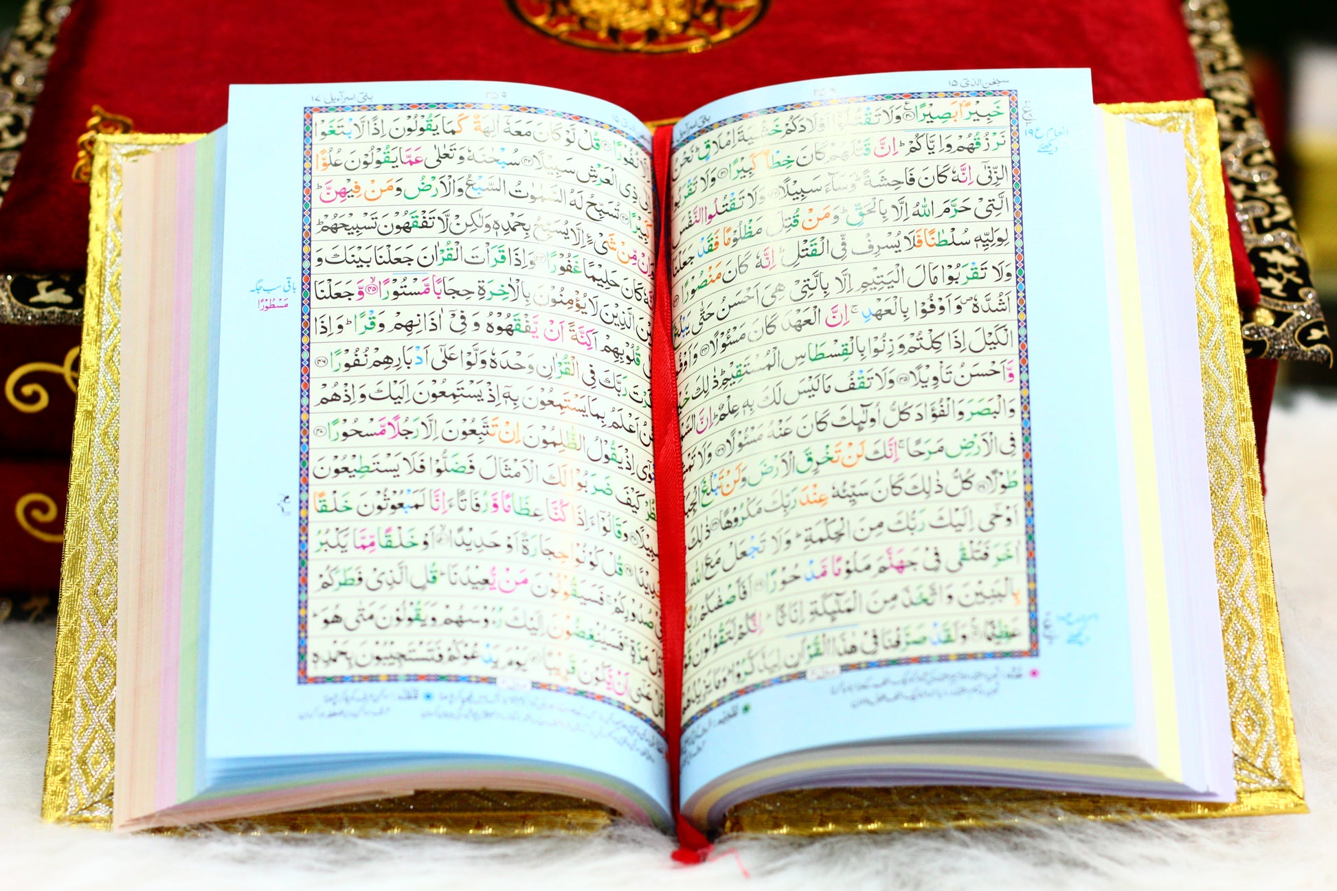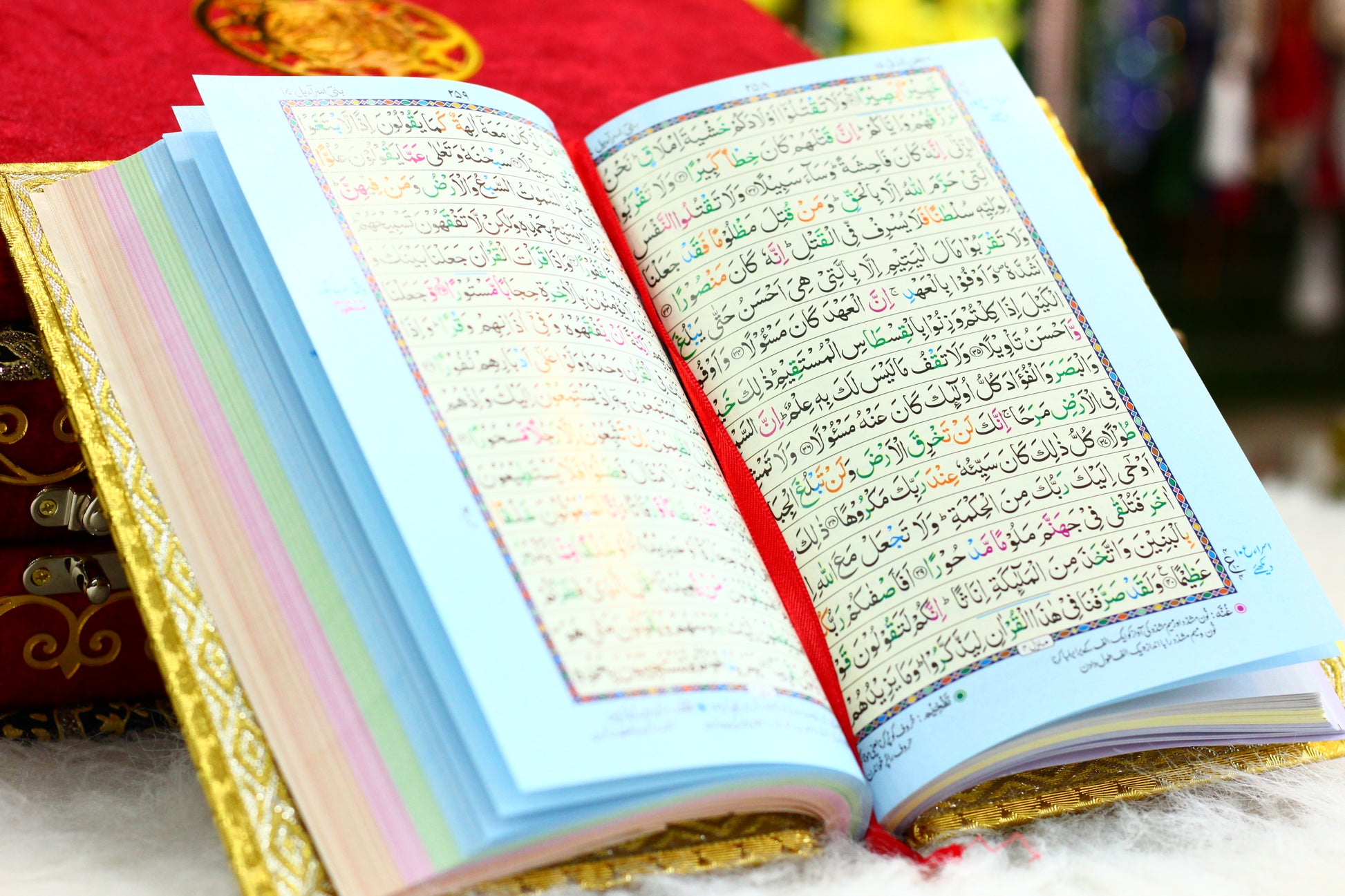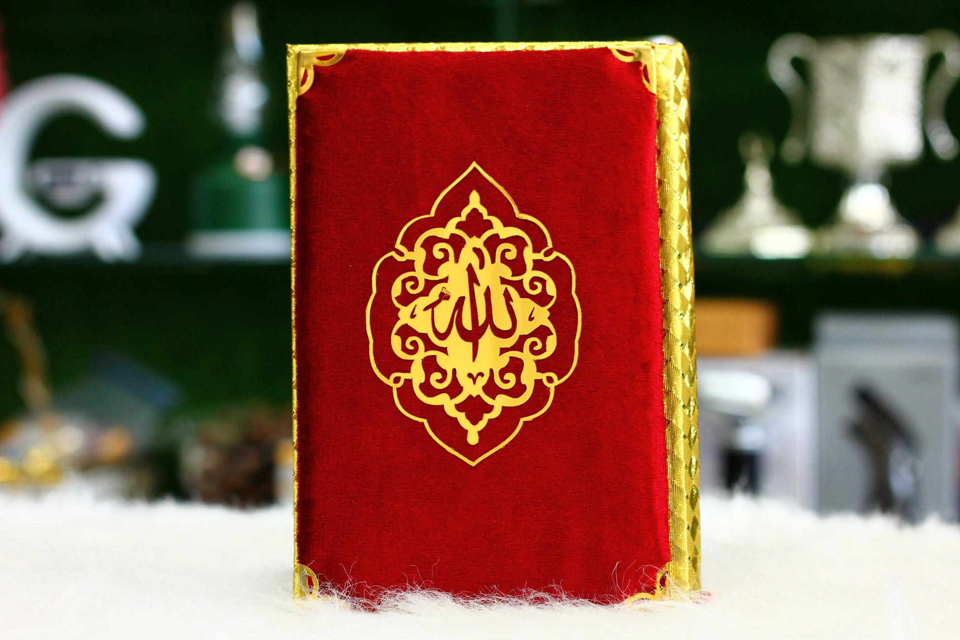 - A beautiful red bridal-style Quran cover, adorned with intricate designs and made from high-quality material