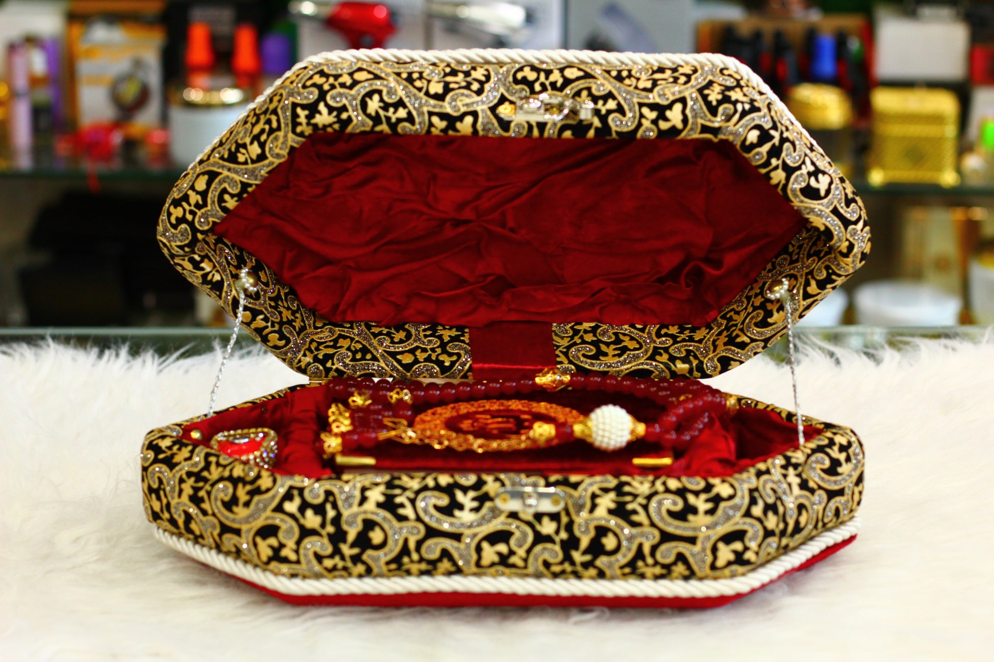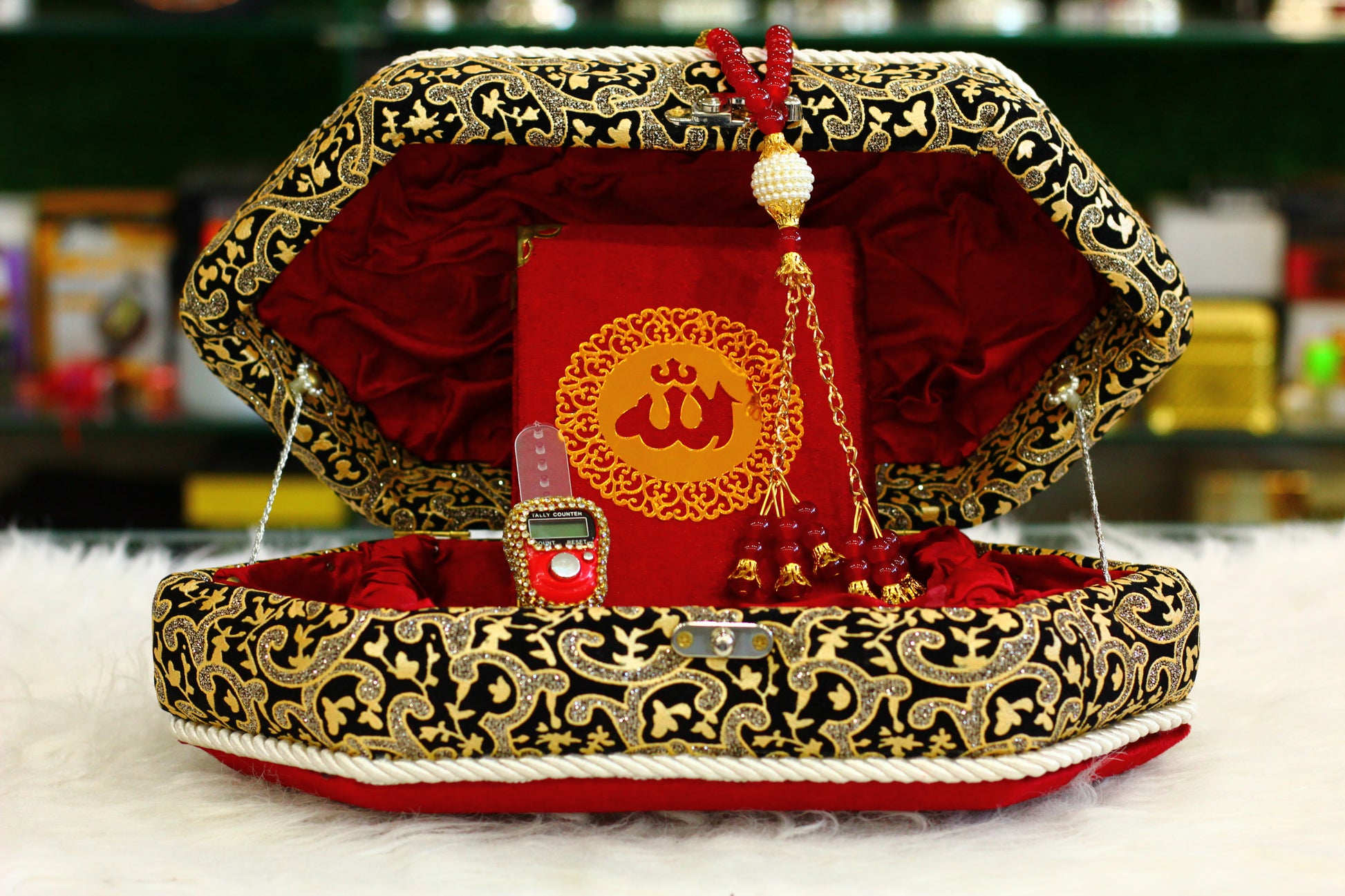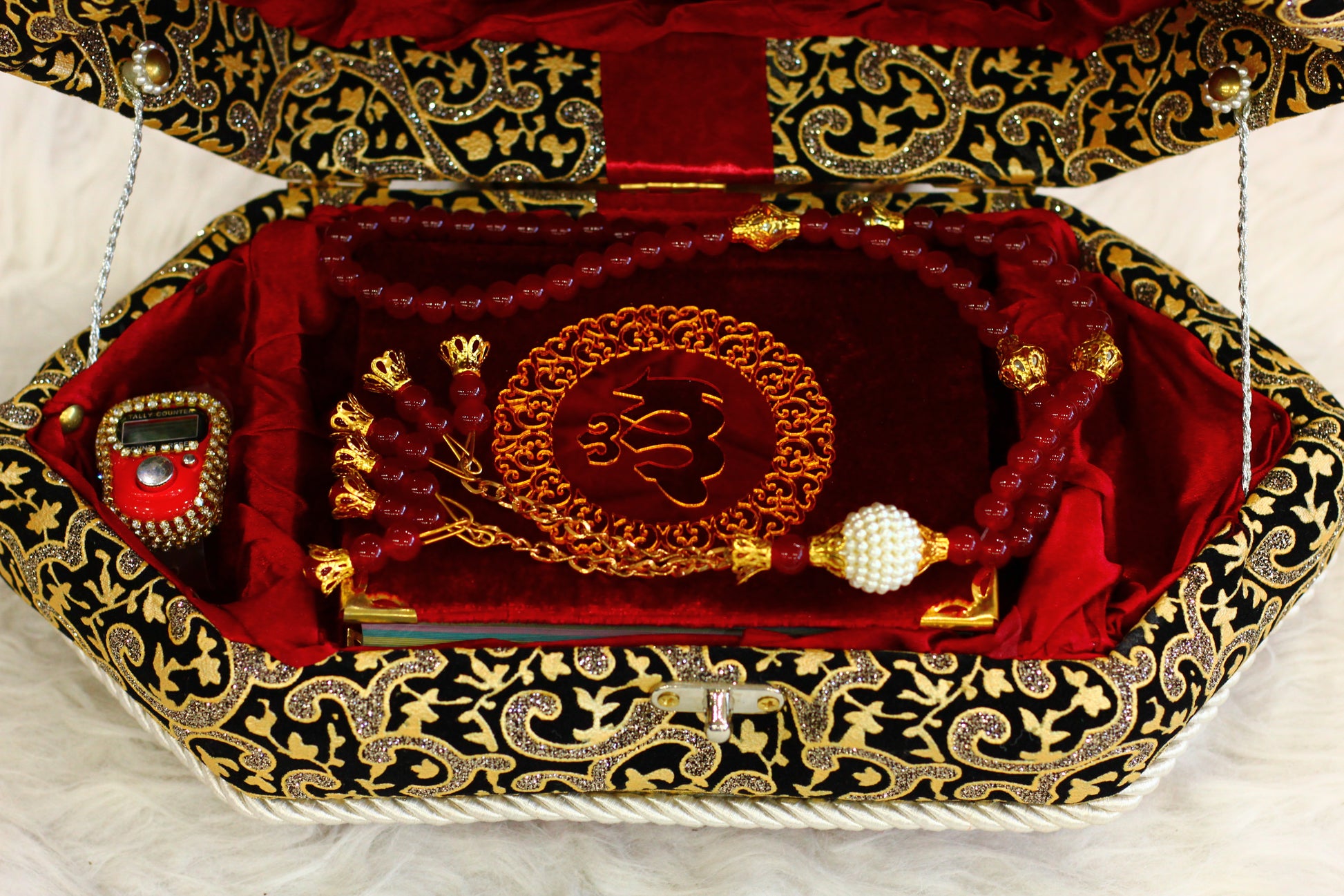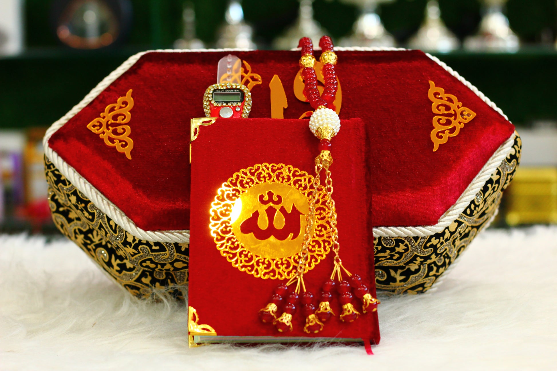 Our Red Quran Pak with Stylish Box is a modern and elegant way to carry and store your holy book. This sleek set features: