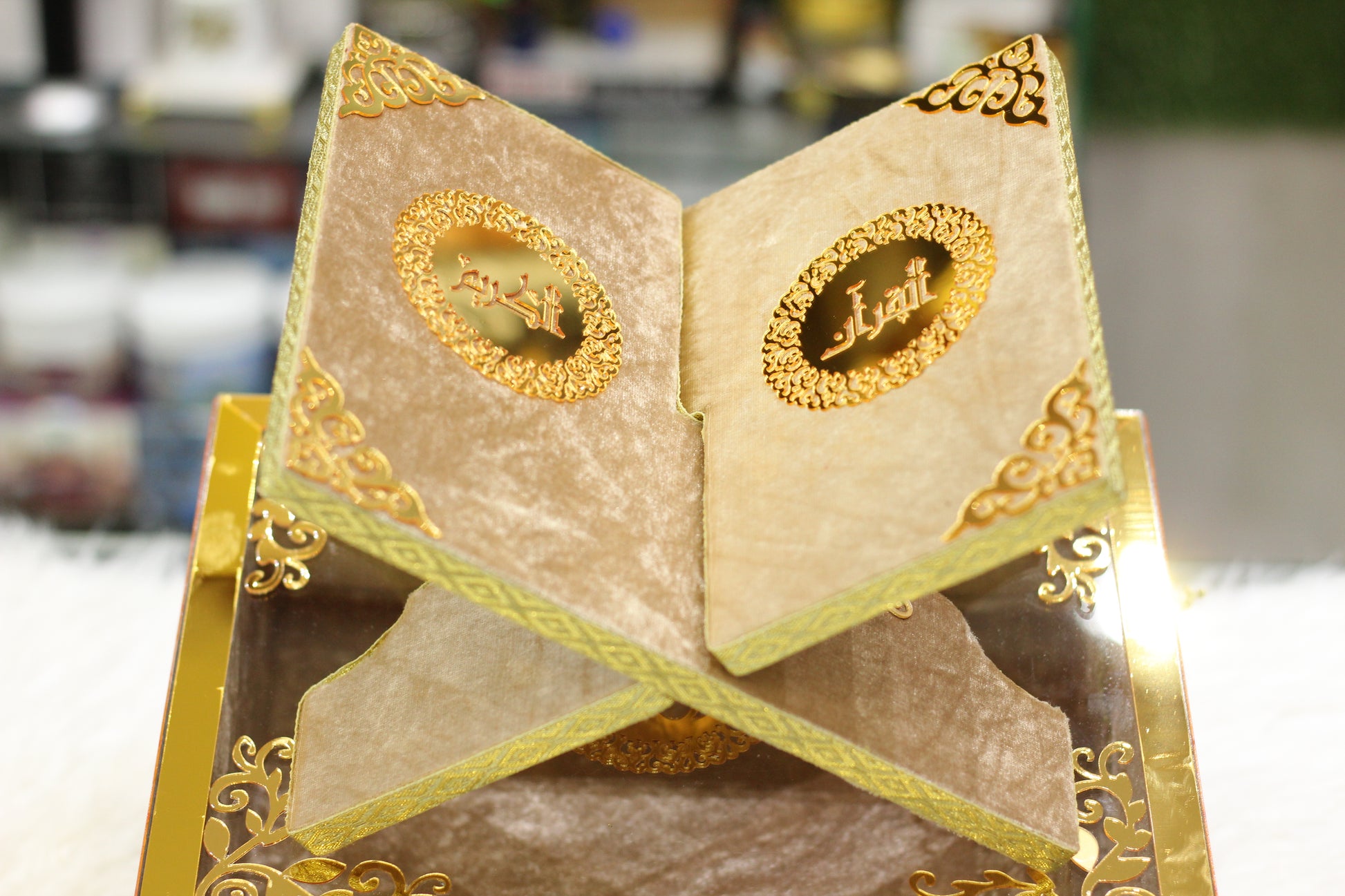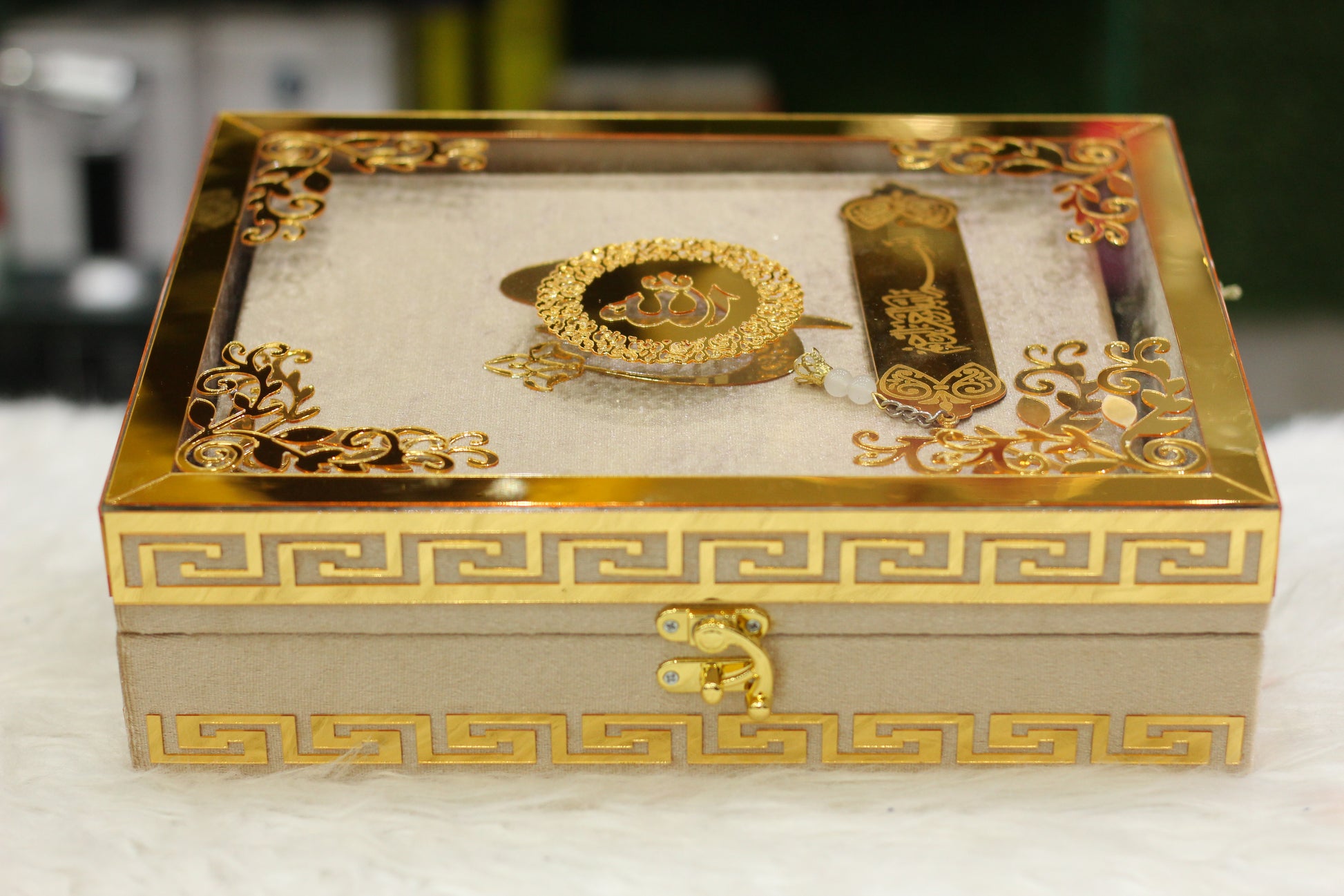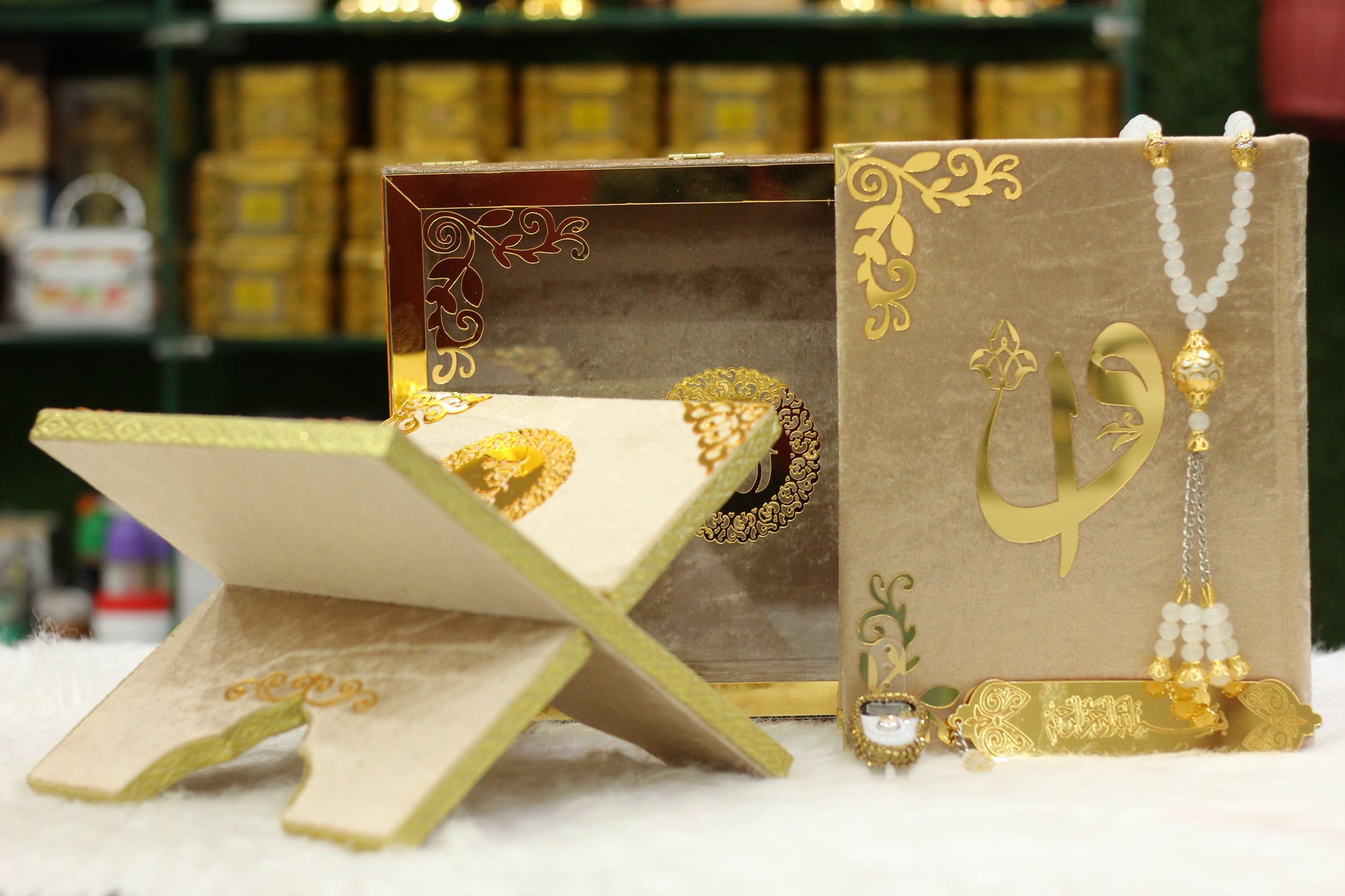 Skin Golden Acrylic Box Quran Pak with Rehal, Tasbih, and Counter