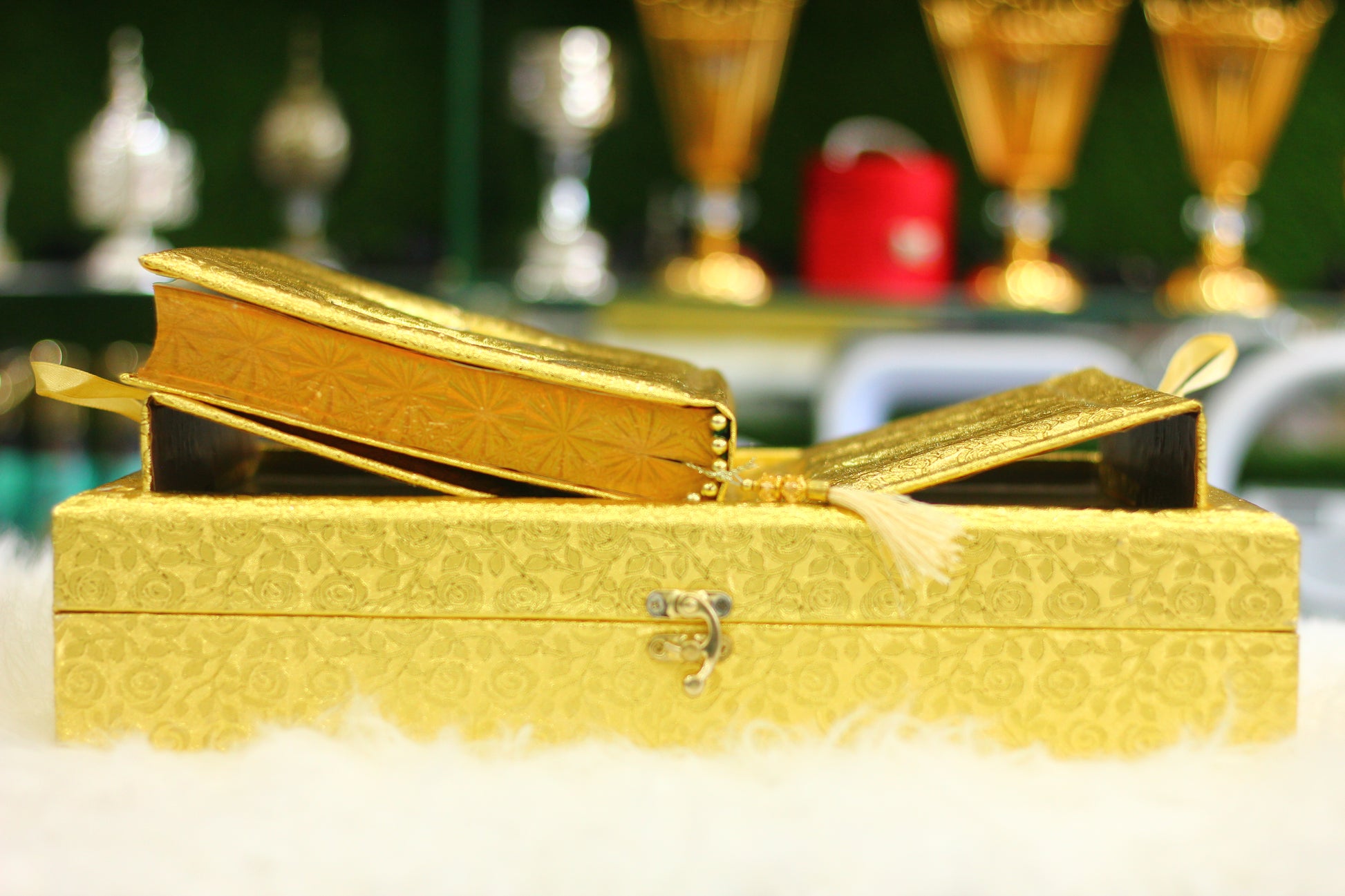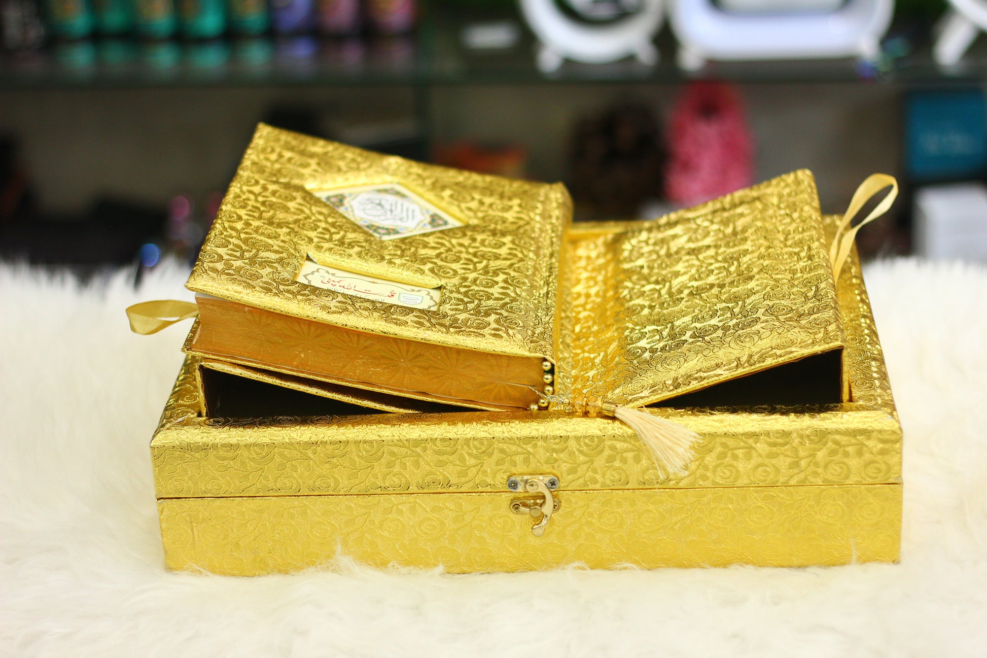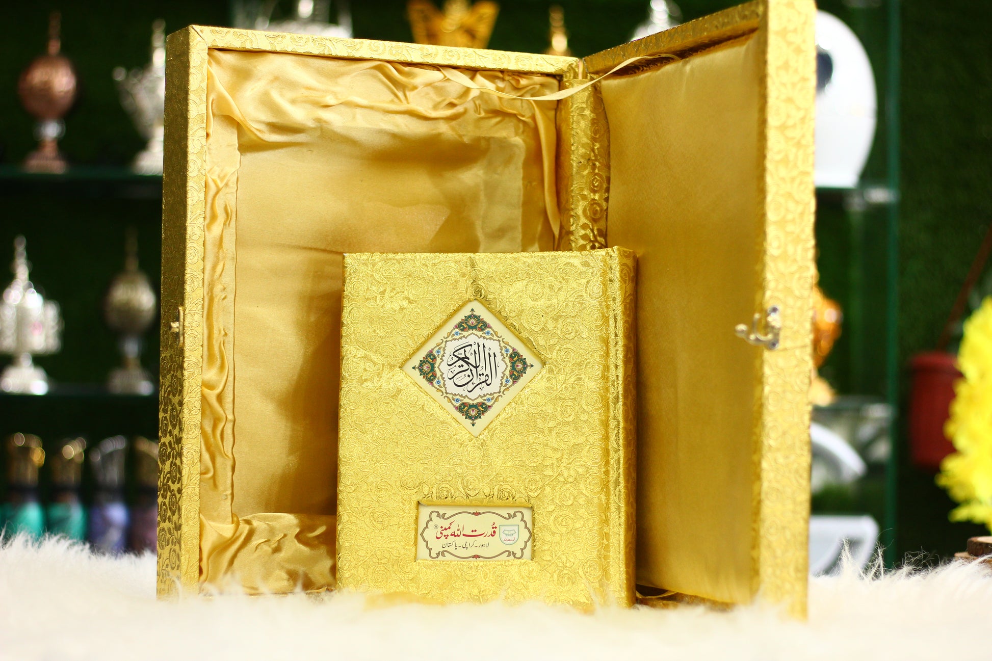 The accompanying golden box is the perfect storage solution, keeping your Quran safe and secure while adding a touch of luxury to your bookshelf or prayer space. The golden exterior and plush interior will cradle your Quran in elegance and sophistication.